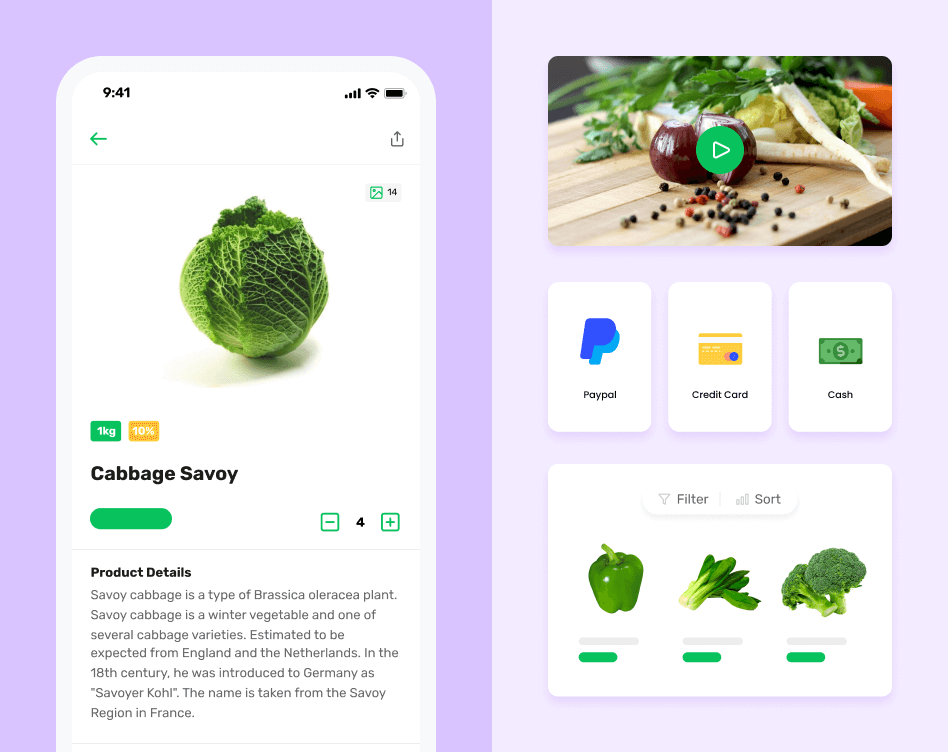 Spcialised grocery delivery app interface showcasing, a product page, featured video, payment icons and product cards