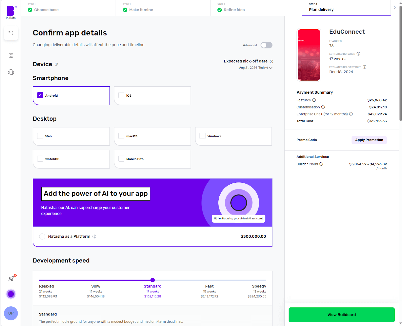 Buildcard provides you with a bird's eye view of all the selections you made in the previous steps. Here, you can review all the features, cost per feature and delivery details.