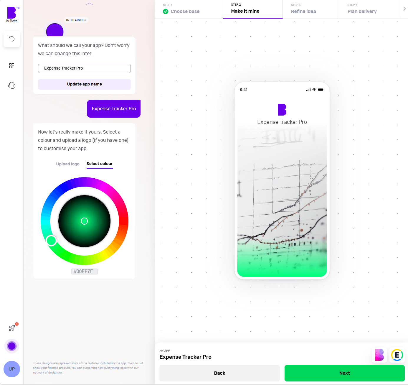 The 'Make it mine' step aligns your app with the identity of your brand. In this step, you can give the name to your app, choose the colour scheme using the colour wheel and upload the logo of your brand.